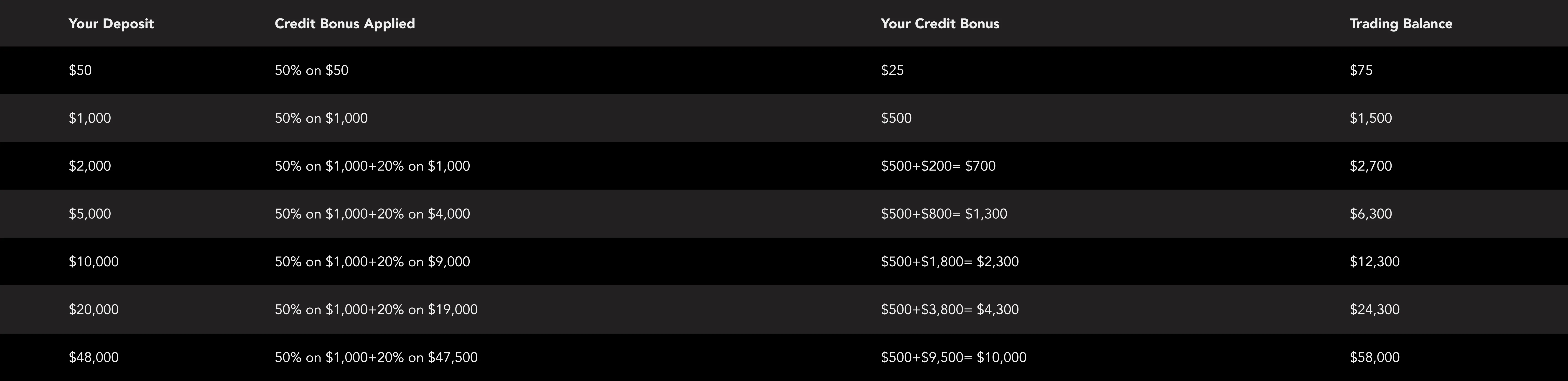 5.Eligible Clients (both new and existing clients), who meet the criteria set forth herein are able to receive credit bonuses or otherwise known as trading credit, equal to: