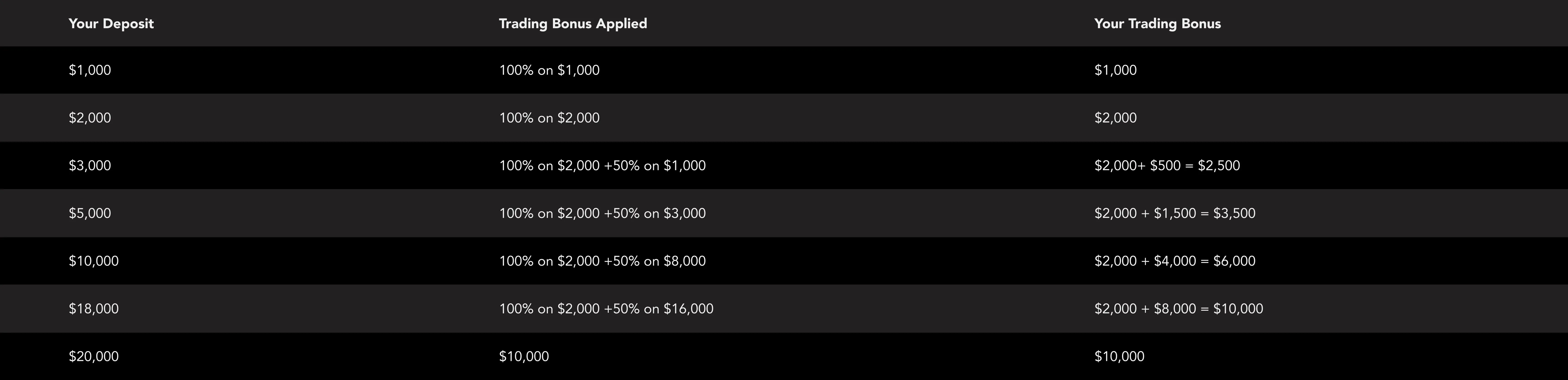 • c.The total amount of trading bonus (es) that may be accumulated during this promotion is set to 10,000 USD in bonus(or currency equivalent), per Eligible Client.